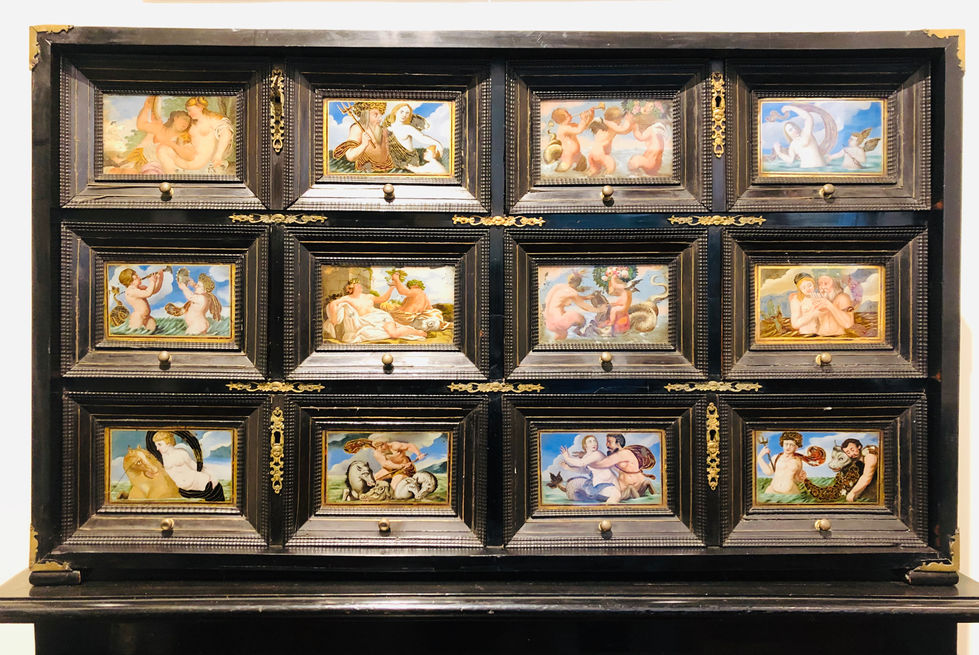 Stipo ebanizato, Napoli di epoca Luigi XIV, con pitture sottovetro in cassetti singoli e doppi.